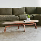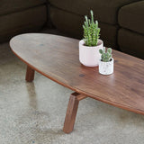 Channelling classic mid-century style with the relaxed ambience of 1970’s Modernism, the Solana Oval Coffee Table showcases solid wood craftsmanship and sculptural beauty. The organic curves of the tabletop rest upon angular legs, creating a pleasing contrast unified by the warmth of the smooth wood grain. Visible joinery details—seamless wedged tenon joints in the top, finger joint detailing in the legs—add subtle interest to this refined accent piece. Part of the Solana Table Series, it is designed to nest with the Solana Triangular End Table or substitute the Solana Triangular Coffee Table.
