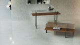 Terrace is a beautifully functional table grouping. Combining tempered glass tops, open display storage, and thick panels on steel supports, the collection includes two coffee table sizes, an end table, and a matching console.