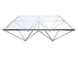 A glass table top supported by a meticulous framework of steel rods, the Origami square coffee table presents a hypnotic fusion of geometry and design. The Origamis 12mm tempered glass measures 47 inches on each side.