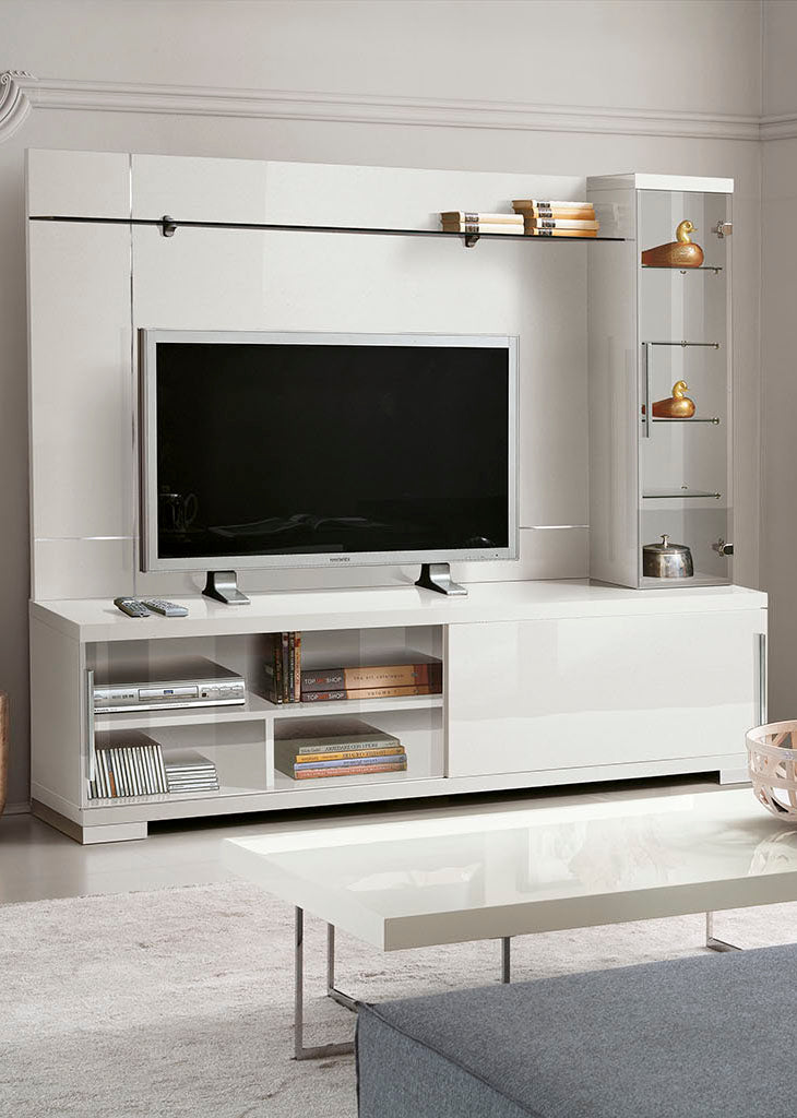 Defined by its glossy finish and clean-lined design, the Asti Entertainment Center builds on top of a sliding door TV base and instantly elevates your living room in a sophisticated style. With a back panel for cable management and side display cabinet, it's a storage piece and a work of art.