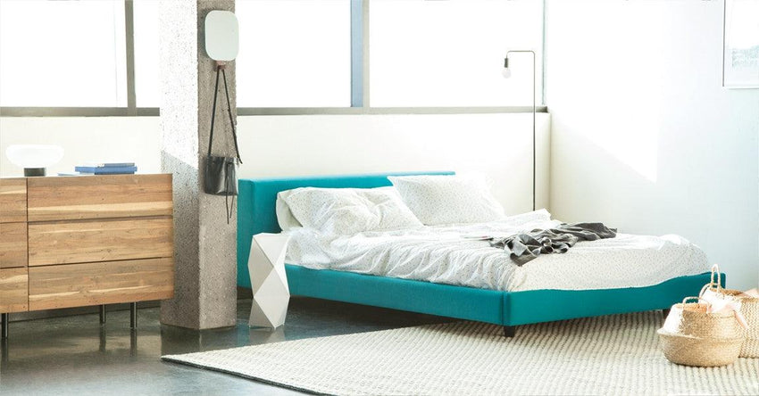 The Bento upholstered bed features low, modern proportions with a comfortable headboard. Inset legs give the bed a floating appearance. The Bento is customizable in over 200 fabrics as well as select leathers.