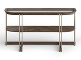 The Elora table group beautifully embodies both architectural and Art Deco elements, offering a sophisticated and unique look. This striking appearance is achieved through a clever combination of modern materials, seamlessly blending wood, glass, and metal. Each table showcases a wood-framed, clear glass top that provides a glimpse of the stunning wood base and elegant metal legs. The hickory veneers are accentuated by a warm Walnut finish and paired with Tarnished Silver metal legs, creating a chic and luxurious character that can be placed in any desired space.