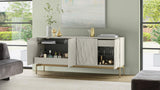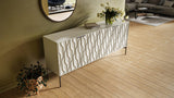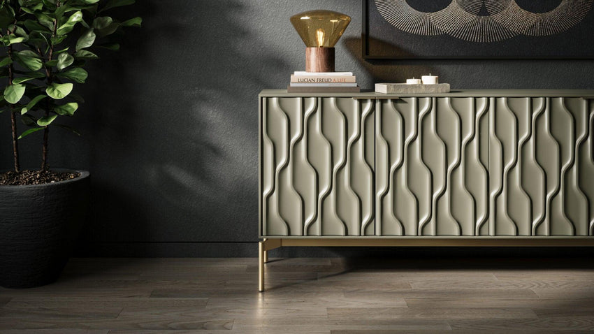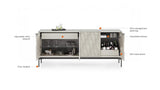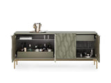 Seamlessly blending form and function, Mesa features two adjustable shelves and two utility drawers to create a customizable wealth of storage space hidden behind the stunningly beautiful door design.