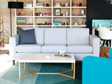 Solo Sofa 80"w x 35"d x 32"h Weight: 110 pounds Seat 23"d x 17"h Arm 6"w x 26"h Leg 5"h Warrenty: Material & Workmanship: EQ3 seating products are warranted against defects in material and workmanship for two (2) years. Cover: EQ3 fabric products are warranted against wear under normal care and conditions for a period of one (1) year. EQ3 leather products are warranted against tearing and splitting for a period of two (2) years.Cushions: EQ3 cushions are warranted for a period of two (2) years against collapsing. Foam softening is normal and not covered under the warranty. Construction/Frame: EQ3 frames and interior construction are warranted for life (25) years. Care: Vacuum upholstery regularly with an upholstery attachment To prevent fading, avoid exposing upholstered pieces to direct sunlight For cleaning guidelines,reference your fabric's cleaning code Spot clean with a damp cloth or sponge, don't rub, treat stains immediately For persistent stains and overall cleaning, contact a professional upholstery cleaning company.