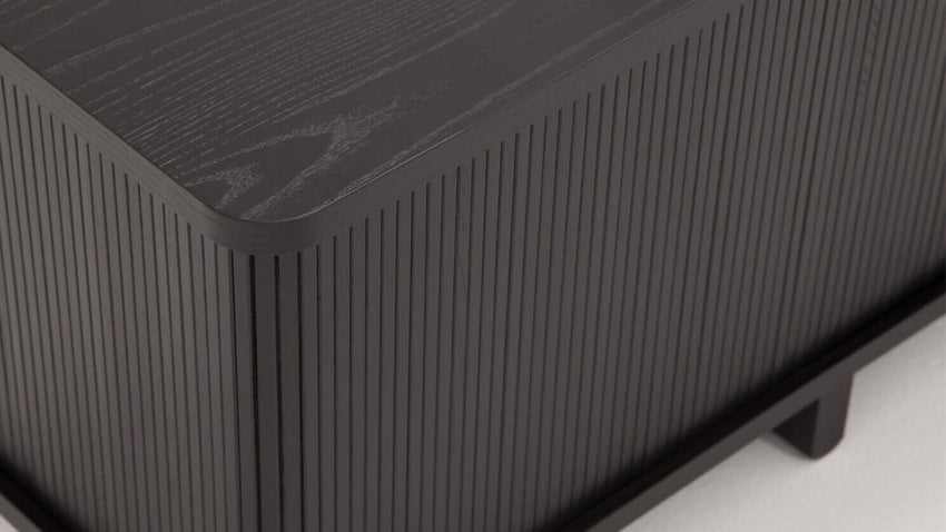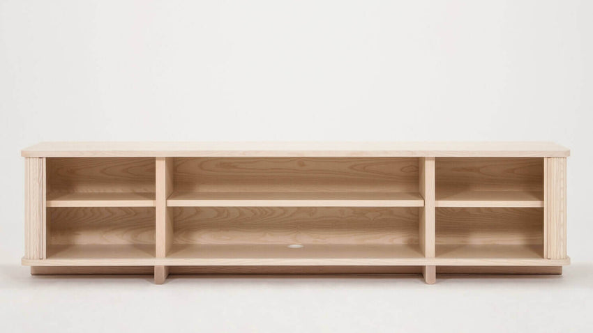 The Tambour collection is reminiscent of traditional roll-top desks made popular in the 19th century. Consisting of individual solid American ash slats that are linked together with a hidden membrane, the pieces roll along a track, evoking memories of the traditional function, yet, reimagined for a modern context. Adjustable shelves and Tambour doors allow for seamless integration with electronic components when used as a media unit, while ample storage space lend themselves to dining and office spaces as well.