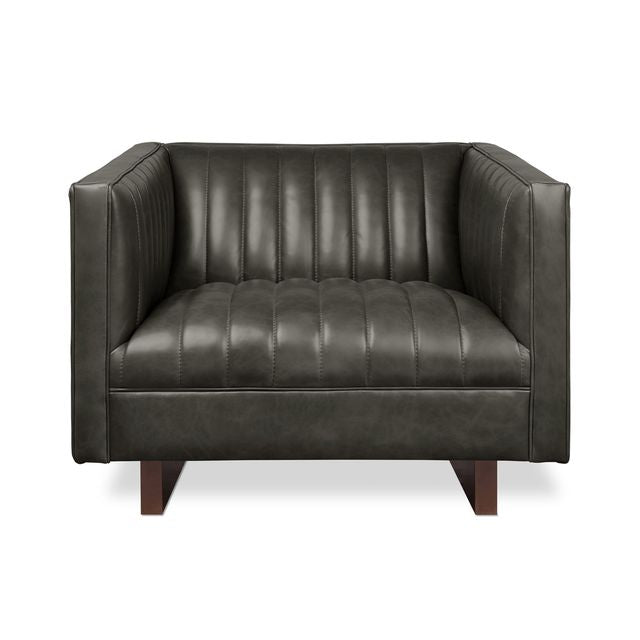 The Wallace Chair is a modern reinterpretation of the classic English Chesterfield design. The channel-stitched leather upholstery on the seat, back, and arms create a surface that is both visually striking and remarkably comfortable. Piping details, sloping armrests and an angular wooden base add sculptural, contemporary flair, while luxurious channelled padding makes it perfect for lounging. Available in two vintage leathers, chosen for their unique grain characteristics that will age beautifully and develop a rich natural patina over time. Matches perfectly with the Wallace Sofa.