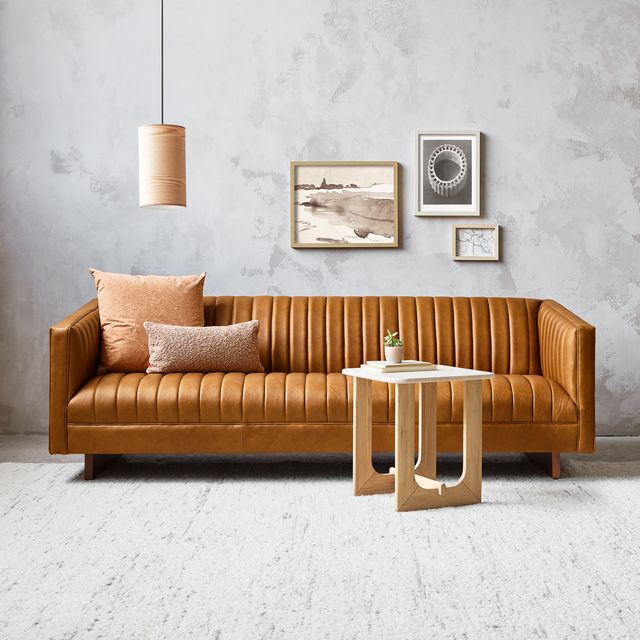 The Wallace Sofa is a modern reinterpretation of the classic English Chesterfield design. The channel-stitched leather upholstery on the seat, back, and arms create a surface that is both visually striking and remarkably comfortable. Piping details, sloping armrests and an angular wooden base add sculptural, contemporary flair, while luxurious channelled padding makes it perfect for lounging. Available in two vintage leathers, chosen for their unique grain characteristics that will age beautifully and develop a rich natural patina over time. Matches perfectly with the Wallace Chair.